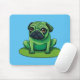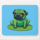 Niedlicher grüner Mops, der einem Frosch ähnelt, der auf einem Lilipad sitzt. Die Hintergrundfarbe kann geändert werden.