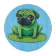 Niedlicher grüner Mops, der einem Frosch ähnelt, der auf einem Lilipad sitzt. Die Hintergrundfarbe kann geändert werden.