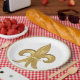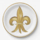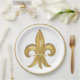 Diese Party-Platte weist eine goldene Lilie in der Mitte auf einem hellen, weißen Hintergrund mit einem goldenen Rand um den Rand. Koordiniert mit den anderen Produkten in meiner Much Ado About Nothing Collection.