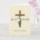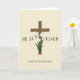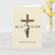 Diese Karte zeigt ein stilisiertes Holzkreuz in erdigem Braun mit einer schwachen Holzmaserung, zentriert auf einem weichen cremefarbenen Hintergrund. Vom Fuß aus öffnen sich drei weiße, lilienähnliche Blüten mit je sechs gebogenen Blütenblättern, sanft schattiert, um Tiefe zu verleihen, während schlanke grüne Stiele und Blätter am senkrechten Balken nach oben klettern. Die nach oben gerichtete Bewegung des Grüns und die Art, wie die Blüten sich zum Kreuz neigen, erzeugen eine zarte, freundliche Nähe, wie eine stille Geste der Unterstützung. Die Worte „ER IST AUFERSTANDEN“ erscheinen in tiefgrüner Schrift auf beiden Seiten des Kreuzes, gleichmäßig ausbalanciert, um das zentrale Bild zu rahmen. Unten steht „OSTERSEGEN“ in derselben tiefgrünen Farbe, ausgerichtet, um das Layout zu verankern, ohne das Kunstwerk zu überladen. Die Gesamtpalette bleibt natürlich und ruhig – warmes Braun, knackiges Weiß, frisches Grün