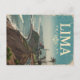 Stilvolle Postkarte von Limas Klippenküste, Surfer darunter und koloniale Balkone in Miraflores. Verwenden Sie coole Vintage Töne und fett formatierte Skripte "Lima" über den Ozean.