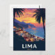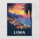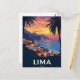 Capture the vibrant, coastal beauty of Lima, Peru, with this spectacular vintage-style postcard. The design features colorful buildings nestled on cliffs overlooking the Pacific Ocean, framed by palm trees, all set against a stunning, warm sunset sky. This travel poster is perfect for lovers of Peruvian culture, South American travel, and tropical coastal scenes. Ideal for sending greetings, keeping as a keepsake, or framing as cheerful wall art.