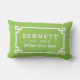 Stilvolle Lumbalkissenkonstruktion mit weißgriechischer Hauptgeometrie und Monogramm, die mit einem verheirateten Familiennamen oder Familiennamen personalisiert werden können, feststehendem Datum (das Jahr verheiratet oder das Jahr, in dem das erste Kind geboren war). Passen Sie den limiengrünen Hintergrund an, um sich mit Ihrer Außendekoration abzustimmen.