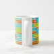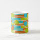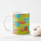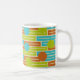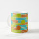 Diese Tasse hat ein modernes Design aus sich wiederholenden Rechtecken in Kalkgrün, Zimtbraun und Türkis mit Kreisen, die oben angeordnet sind.