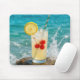 Eine erfrischende Limonade mit Eiswürfeln und Kirschen wird mit einer Zitronenscheibe und einem gestreiften Strohhalm, Set vor einem Hintergrund des türkisfarbenen Meeres