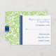 Die RSVP-Karten werden in elegantem und zeitgenössischem, hellen Apfelgrün, dunkelmarineblau und einem Vintagen Damastmuster mit weißem klassischem und schicken Blumenmuster hochgeheizt. Geeignet für Ihre Hochzeitsdetails, erhältlich in vielen passenden Hochzeitsartikeln.