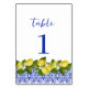 Diese Tischnummern prägen wunderbar das Wesen einer in Italien inspirierten Feier, die den hellen Leinenscharz mit der zeitlosen Eleganz der blauen Mosaikfliesen verbindet. Der Hintergrund ist reich, in blauen Mosaikfliesen gehalten und erinnert an traditionelle italienische Keramiken, die eine Touch von Eleganz und Charme aus der alten Welt schaffen. Lebhafte gelbe Zitronen mit üppig grünen Blätter verteilen sich künstlerisch auf die Einladung und sorgen für ein frisches, lebendiges Ambiente. Personalisieren Sie diese einfach auf der Hauptseite. Karo in der Limone Hochzeitssuite.