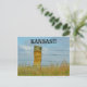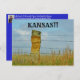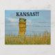 Ein Foto eines Gesichts, das auf einem Stone Post mit blauem Himmel, Präriegras und Barbwire geschnitzt wird, das in der Nähe aufgespielt wird und hell und farbenfroh ist. Das ist South von Lucas Kansas auf der Landschaftlichen Route Highway. Das ist auf einer POST CARD.