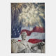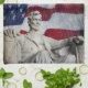Foto von Abraham Lincolns Statue an der Lincoln Memorial in Washington DC mit einem schönen explodierenden Feuerwerk und der U.S.A.-Fahne im Hintergrund. Großes Kompositbild für die patriotischen Feiertage Amerikas.