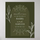 Einfache botanische Linienkunst mit Skript, Pärchennamen und Hochzeitsdatum auf grünem Hintergrund mit Bogen.