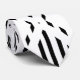 Diese Krawatte hat ein modernes Design von schwarzen senkrechten Linien mit Hexagonen horizontal auf einem Feld von Weiß.