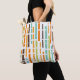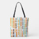 Diese Tote-Tasche hat ein modernes Design von vertikalen Linien in den 1970er Jahren orange, braun, grün und blau auf einem Feld von Weiß mit horizontalen weißen Linien, die sie überqueren.
