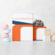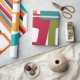 Dieses Verpackungspapier hat ein modernes Design von Linien und Rechtecken in Retrotönen in Orange, Gold, Cranberry, aquamarin, grün, blau, türkis und grün.