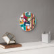 Diese Wanduhr ist in einem modernen Design aus Linien und Rechtecken in Retrotönen in Orange, Gold, Cranberry, aquamarin, grün, blau, türkis und grün gehalten.