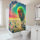 Dieser Duschvorhang hat ein Löwendesign darauf.