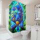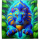 Dieser Duschvorhang hat einen künstlerischen Löwen darauf.