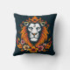 Stilisierter Löwenkopf in der Mitte, geschmückt mit einer Krone. Der Löwenmane ist mit lebhaften Orange- und Gelbtönen illustriert, die an Flammen erinnern.