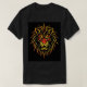 Die künstlerische Darstellung eines Löwenkopfes vor einem schwarzen Hintergrund. Der Löwe ist in lebendigen Farben dargestellt, hauptsächlich Rot, Gelb und Orangen, was ein feuriges Aussehen schafft. Das Mane wird mit fließenden Linien übertrieben, was dem Design eine dynamische Qualität verleiht. Die Gesichtszüge sind stark und kühl, zeigen einen heftigen Ausdruck, mit durchdringenden Augen und prominenten Whiskers.