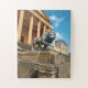 Löwenstatue in einem Herrenhaus-Gebäude.