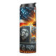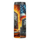 Auf diesem Bild befindet sich ein individueller Sattelwagen mit einem dunklen, metallischen Körper, mit fett lionenförmigen Kopfmotiven auf der Grille und Schlafkabine geschmückt, sowie eine stilvolle Chromflamme. Der Hintergrund ist eine dynamische Kombination aus einer wehenden amerikanischen Flagge und intensiven, leuchtenden Orange- und Gelbflammen, die eine kraftvolle und patriotische Szene schafft.