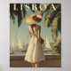 This charming vintage poster depicts a graceful woman in a classic 1950s dress standing at the harbor in Lisbon. Fishing boats gently float on the water behind her, while the sun casts a warm, golden glow over the historic buildings in the background. The soft retro color palette and nostalgic textures capture the elegance of mid-century coastal life in Portugal. Perfect for lovers of vintage fashion, seaside scenes, and timeless European travel art.