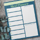 Wöchentlicher Essensplaner in Ocean Blue und Sage Green. Dieser Planer hat 9 weiße Boxen, sodass Sie Ihren täglichen Essensplan erstellen können, sowie Ihre Einkaufsliste und Ideen für die nächste Woche. Die Vorlage für dieses personalisierte Notizblock ist Set für Sie bereit, um Ihren Namen oder Familiennamen hinzuzufügen. Sie können auch die Überschriften bearbeiten - z.B. bevorzugen Sie My Weekly Goals, To Do List und Termine. Der Planer ist auf jeder Seite gedruckt und Sie können jeden wöchentlichen Essensplan abreißen und Ihre Einkaufsliste zum Lebensmittelgeschäft mitnehmen.
