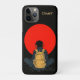 Striking illustration of a person with headphones sitting calmly before a vivid red sun, wearing a yellow backpack against a black background. This artistic iPhone case captures a mood of relaxation and reflection, perfect for music lovers and those who enjoy minimalist, expressive designs.