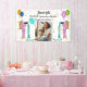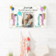 Feiern Sie Ihr Kind zum ersten Geburtstag mit seinem Zodiac-Zeichen. Der Aquarius ist rosa, lila, dunkelblau und hellblau goldfarbenes Muster. Farbenfrohe orangefarbene, dunkelblaue, rosa, grüne und türkisblaue Ballons schmücken das Banner. Goldkonfetti werden zufällig auf dem weißen Hintergrundbanner angezeigt. Passen Sie mit Ihrem Foto und Namen an.