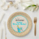 Die Lage des Hotels ist sehr gut. Die Gestaltung ist mit Sandkörnern gestaltet. In der Mitte befindet sich ein weißer verblasster Kreis mit aquamarinem blauen Schnitt. Am unteren Rand des Kreises befindet sich ein aquamarines blaues Gabel mit einer Schaufel. Neben dem Pagel befindet sich eine Muschel mit weißem Meer. Es gibt einen Text in schwarz und aquamarin blau Schriftart, der auf Welcome Little Beach Baby steht. Der Hintergrund des Strandes ist ein Bild von Sandstruktur. Das niedliche Design ist perfekt für Ihre Babydusche mit Strandmotiven.