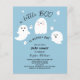 Little Boo Budget Halloween Boy Baby Shower Einladung entworfen mit niedlichen Geistern und winzigen Herzen, blauem Hintergrund und schwarzen Schriftart, für Ihr kleines Boot, das fast fällig ist!