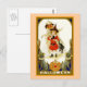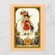Vintage Halloween-Karte mit einem kleinen Jungen, der in einem Zauberhut gekleidet ist und einen Zauberstab hält. Hinter ihm steht ein Geist mit Kürbiskopf und einer schwarzen Katze. Vor dem Haus befinden sich zwei Katzen mit Besen und Hexenhüten und einem kuscheligen Kürbisgesicht.