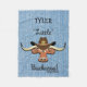 Personalisieren Sie das "Eine von einem Kind" Kleiner Junge's Longhorn Steer Fleece Blank! Es gibt einen Comical Longhorn Steer, der einen Cowboy-Hut mit einem Sheriffs Stern auf einem Hintergrund mit blauem Denim trägt...Umgeben von den Worten...."Kleiner Buckaroo"! Dieses "kleine Buckaroo" Fleece Blanket hat ein passendes Kissen und Lampe! Original Art Design von Künstler Kerry Miller!