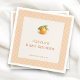 Little Cutie orange gingham baby shower party napkins featuring sweet citrus details and a classic gingham pattern. Perfect for coordinating with a Little Cutie baby shower theme and adding a fresh pop of orange to your dessert or drink table. Ideal for summer, citrus themed, and gender neutral baby showers. Customizable text. Print ready design.