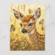 Niedlicher zeichn eines kleinen Hirsches, stehend in einer insektenreichen Wiese, umgeben von großem Gras und Wildblumen.