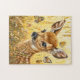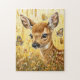 Niedlicher zeichn eines kleinen Hirsches, stehend in einer insektenreichen Wiese, umgeben von großem Gras und Wildblumen.