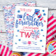 Feiern Sie mit dieser festlichen 4. Juli Party Einladung den zweiten Geburtstag Ihres kleinen Firecrackers! Mit einem spielerischen Rot, Weiß und Blau-Feuerwerk mit charmanter Typografie eignet sich dieses Geburtstagsdesign perfekt für Party im Hinterhof, Ansammlungen oder Feiern zum 4. Juli. Personalisieren Sie Ihre Veranstaltungsdetails, um eine fröhliche, sternförmige Einladung Ihrer Gäste zu schaffen, die Liebe.