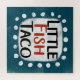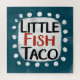 Ein niedliches typografisches Lebensmitteldesign, das "Little Fish Taco" sagt. Es ist schwarz und rot auf einem weißen Rechteck mit funky, spielerisch weißen Punkten, die ihn umgeben, alles auf einem aquamarinen Hintergrund.