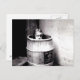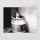 Postkarte mit einem Foto eines kleinen Mädchens aus den 1930er Jahren, das sich in einem Fass versteckt