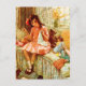 Vintage Abbildung eines kleinen Mädchens, das am Fenster näht. Sie ist von allen ihren Spielsachen umgeben, wie einem Teddybär und vielen Puppen. Aus "Das kleine Mädchen's Nähbuch".