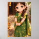 This heartwarming illustration captures the innocence and charm of a young girl dressed in a traditional green saree, beautifully detailed with golden patterns. Her tiny figure, soft smile, and delicate braid adorned with flowers reflect purity, joy, and the simplicity of childhood wrapped in cultural elegance.
