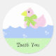 Eine niedliche kleine rosa Ente mit einem großen Bogen um ihren Hals und einem niedlichen Ausdruck. Eine weiche grüne Grenze mit weißen Punkten.