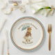 Rustic-style baby shower collection, decorated with soft colors and a vintage watercolor image of a cute little bunny with a parasol, in a style similar to Beatrix Potter's Peter Rabbit.