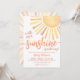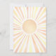 On the back, a bold sunburst radiates outward in classic sun colors—shades of yellow, orange, and a touch of red—adding a cheerful, energetic backdrop that complements the front design. This gender-neutral invitation is perfect for celebrating the mother-to-be and welcoming a new little ray of sunshine into the world, with a fun mix of boho, retro, and modern elements.