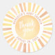 This round sticker design features a classic sun at the center, with the cheerful phrase “Thank You!” placed right on top. The sun’s rays shine in warm shades of yellow and orange, creating a soft and timeless look for your baby shower.