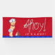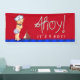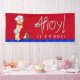 Schönes Babyduschbanner mit bezauberndem blonden Segler Junge auf einem roten und blauen Hintergrund. Sie können Text hinzufügen und die Hintergrundfarbe auf diesem niedlichen nautischen Babyduschbanner ändern.