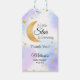 Celebrate your whimsical celestial baby shower with these enchanting favor tags. The design features a gold crescent moon and scattered stars set against a soft purple and blue watercolor backdrop. These tags are the perfect finishing touch for thanking guests at a "Star is Brewing" themed celebration or a magical starry night event.