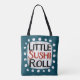 Ein niedliches typografisches Design, das "Little Sushi Roll" sagt. Es ist schwarz und rot auf einem weißen Rechteck mit funky, spielerisch weißen Punkten, die ihn umgeben, alles auf einem aquamarinen Hintergrund.