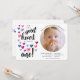 Herzlichen Glückwunsch zum ersten Geburtstag. Lila, blaue und rosa Wasserfarbenherzen mit einem Foto des Einjährigen! Jewel Töne auf einem knusprigen weißen Hintergrund, diese Einladung ist die süßeste.