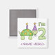 Niedliche grüne Schildkröte mit gelben Herzen auf der Muschel, lila Geburtstagshut und Kerze auf diesem zweiten Geburtstagsdesign.