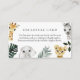 Passen Sie diese Gehäusekarte Ihren Bedürfnissen an! Gut für Details, Registrierung, Hotelunterkünfte, etc. Mit Aquarellsafari-Tieren und tropischen Dschungel-Blätter. Ideal für eine Babydusche oder zum Geburtstag.